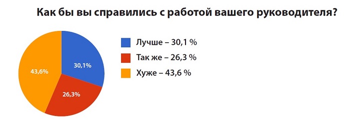 Интересно, что 61,8% участников опроса не хотели бы занять место своего руководителя. При этом 43,6 % считают, что справились бы с этой работой хуже, 30,1% – лучше, 26,3% – так же.